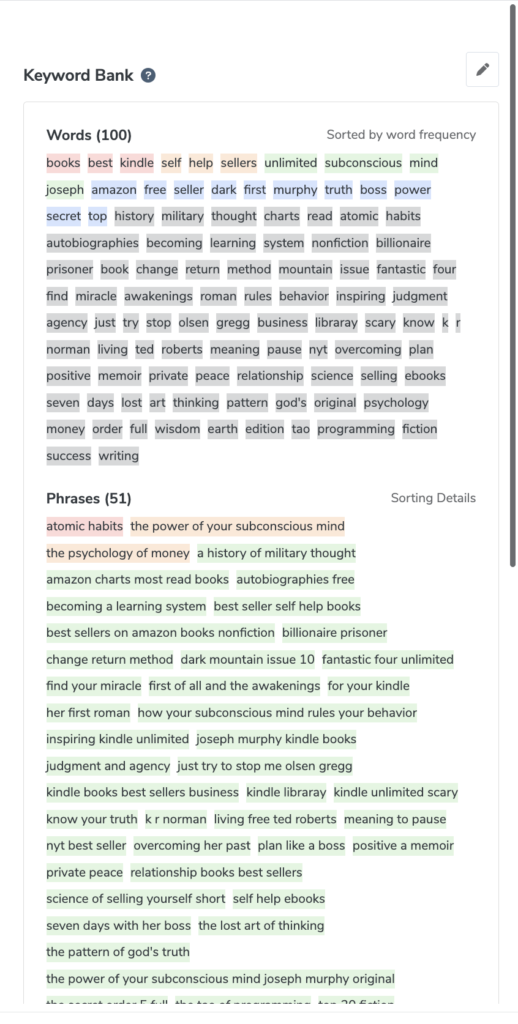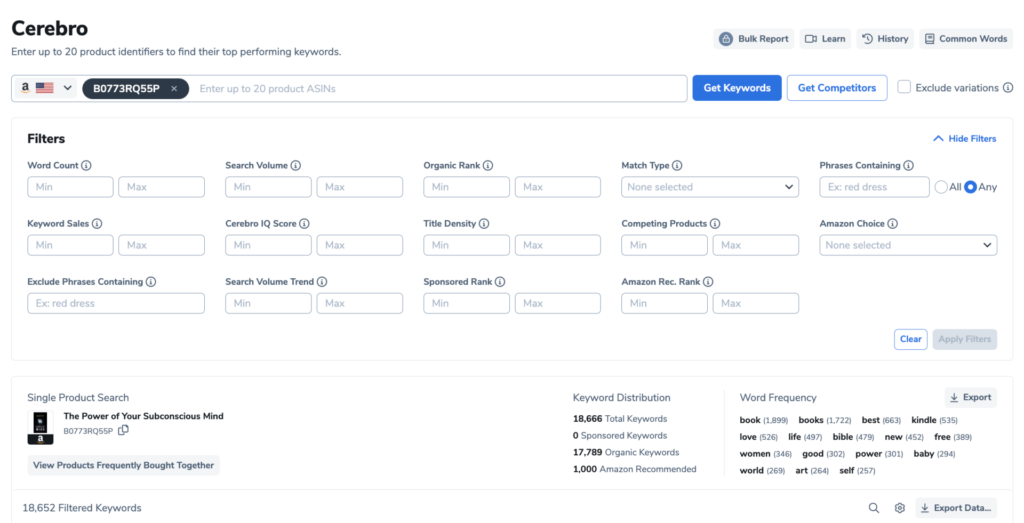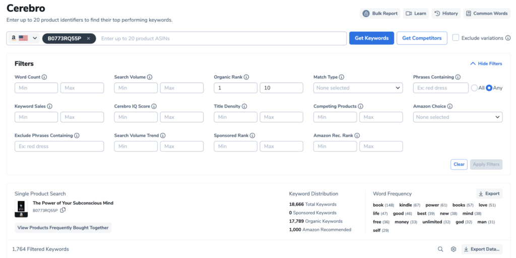 Cu Cerebro, puteți introduce o mână de identificatori de produs pentru a primi o listă de cuvinte cheie cu cele mai bune performanțe. Obțineți o imagine mai bună a strategiei de clasare a concurenței sau a campaniilor de publicitate pentru a vedea o corelație directă cu clasarea cărții dvs. electronice odată ce este publicată.