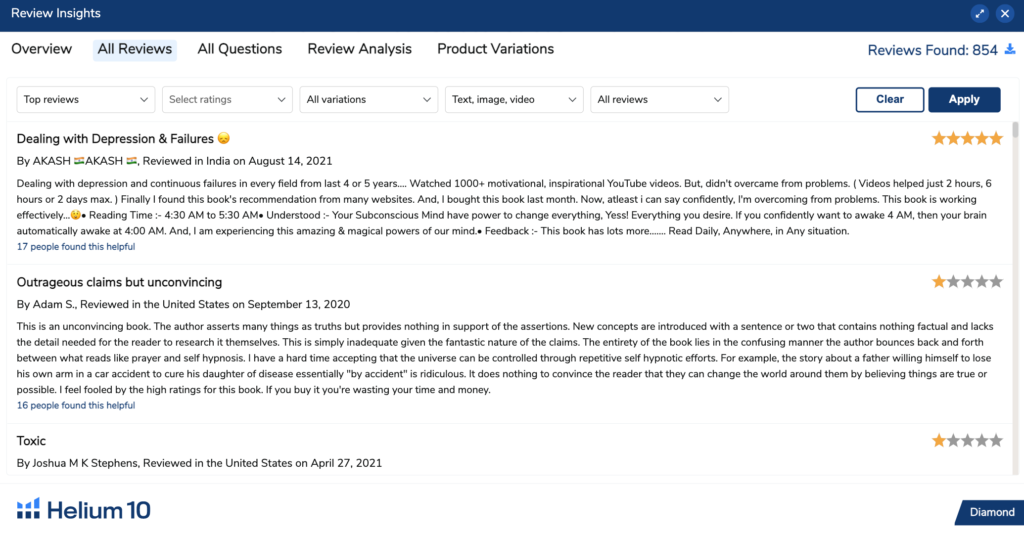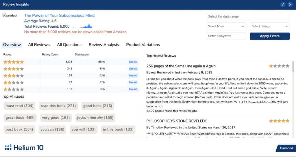 În primul rând, examinați statisticile. Review Insights este un instrument de revizuire Amazon ascuns în interiorul extensiei noastre gratuite Amazon Chrome. Este conceput pentru a vă ajuta să pășiți în mintea consumatorului pentru a identifica subiectele pe care le caută, ce iubesc și de ce nu sunt atât de înnebuniți. Review Insights poate fi folosit și pentru a afla ce iubesc sau urăsc clienții la o anumită carte. Aceasta este o resursă valoroasă și adesea nefolosită pentru a găsi aspecte ale cărților electronice existente pe care le puteți îmbunătăți și studiat pentru a deveni un scriitor mai prietenos cu consumatorii.