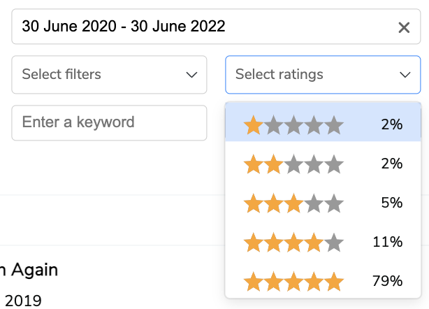 Aveți, de asemenea, un meniu derulant cu stele în care aveți posibilitatea de a afișa recenzii corespunzătoare doar unui anumit rating de stele sau de a selecta mai multe recenzii pozitive și/sau critice dintr-o privire.
