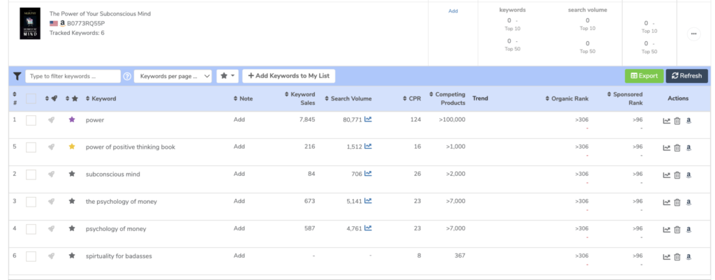Odată ce datele sunt încărcate, puteți vedea vânzările de cuvinte cheie, volumul de căutare, CPR (cate cărți electronice ar trebui să oferiți pentru a vă clasa în prima jumătate a paginii unu pentru cuvintele cheie respective), numărul de produse concurente, clasamentul organic și clasamentul sponsorizat. După cum puteți vedea din captura de ecran de mai jos, această carte nu se descurcă bine în rândurile organice sau sponsorizate, dar, din nou, nu ne-am ocupat destul de mult timp să găsim cuvinte cheie pentru care am DORI să ne clasăm, deoarece aceasta nu este cartea noastră.