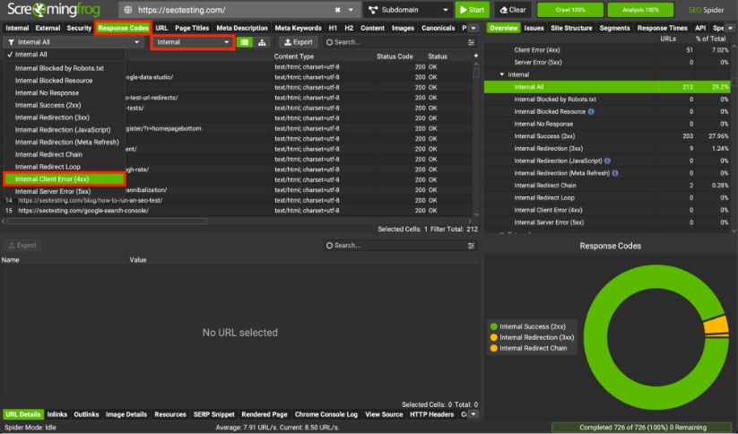 Amintiți-vă că Screaming Frog vă va arăta aici toate problemele, avertismentele și oportunitățile. Trebuie să le filtrați singur, deoarece nu există nicio modalitate de a filtra automat problemele specifice legăturilor dvs. interne.