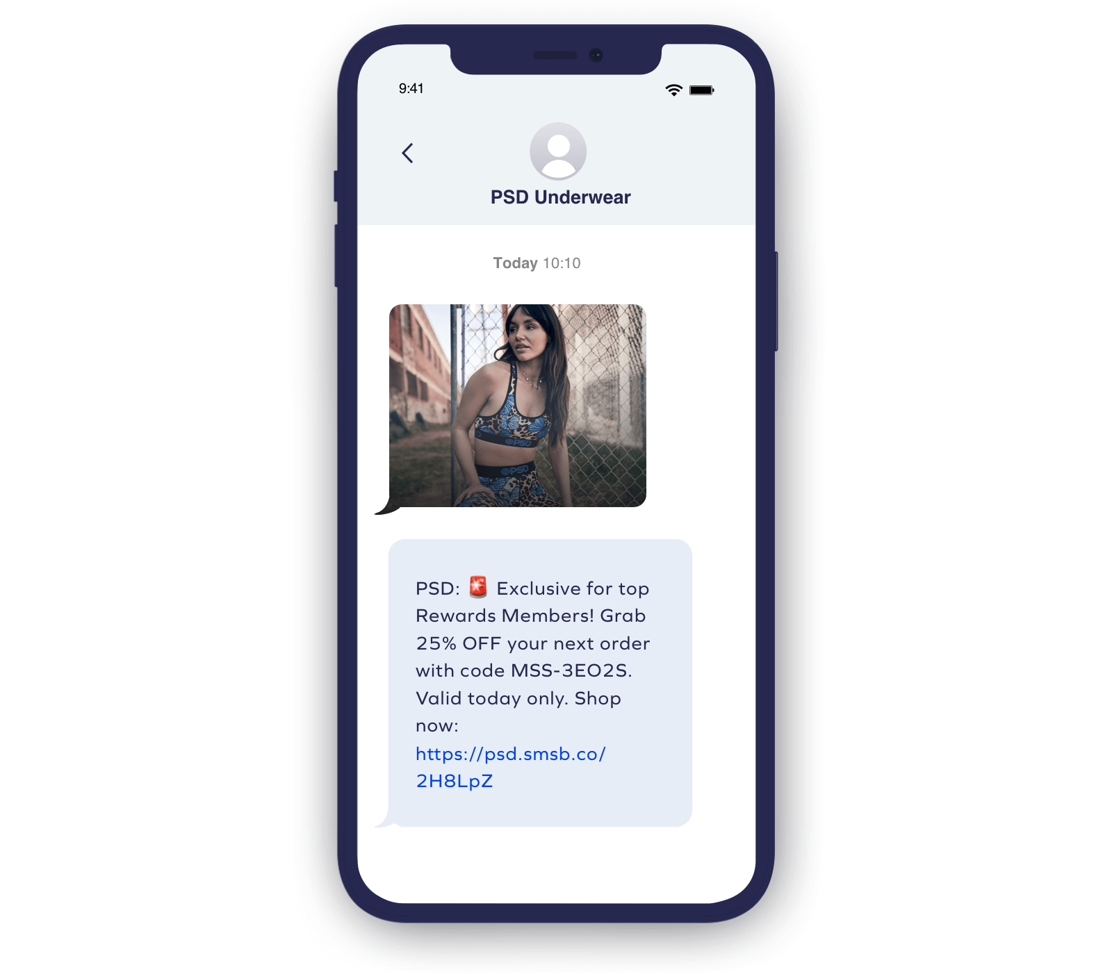 Lenjerie de corp PSD este specializată în lenjerie de corp premium, la prețuri accesibile, care este „fabricată și construită pentru sportivi, creatori de tendințe și oameni care pur și simplu iubesc cu adevărat lenjeria intima”. Cei care iubesc cel mai mult lenjeria PSD, membrii lor de fidelitate, par să iubească și marketingul prin SMS al brandului. Când PSD a folosit SMS-urile pentru a trimite o ofertă exclusivă VIP de 25% direct membrilor de la nivelul Gold, campania a înregistrat un ROI uimitor de 91x .