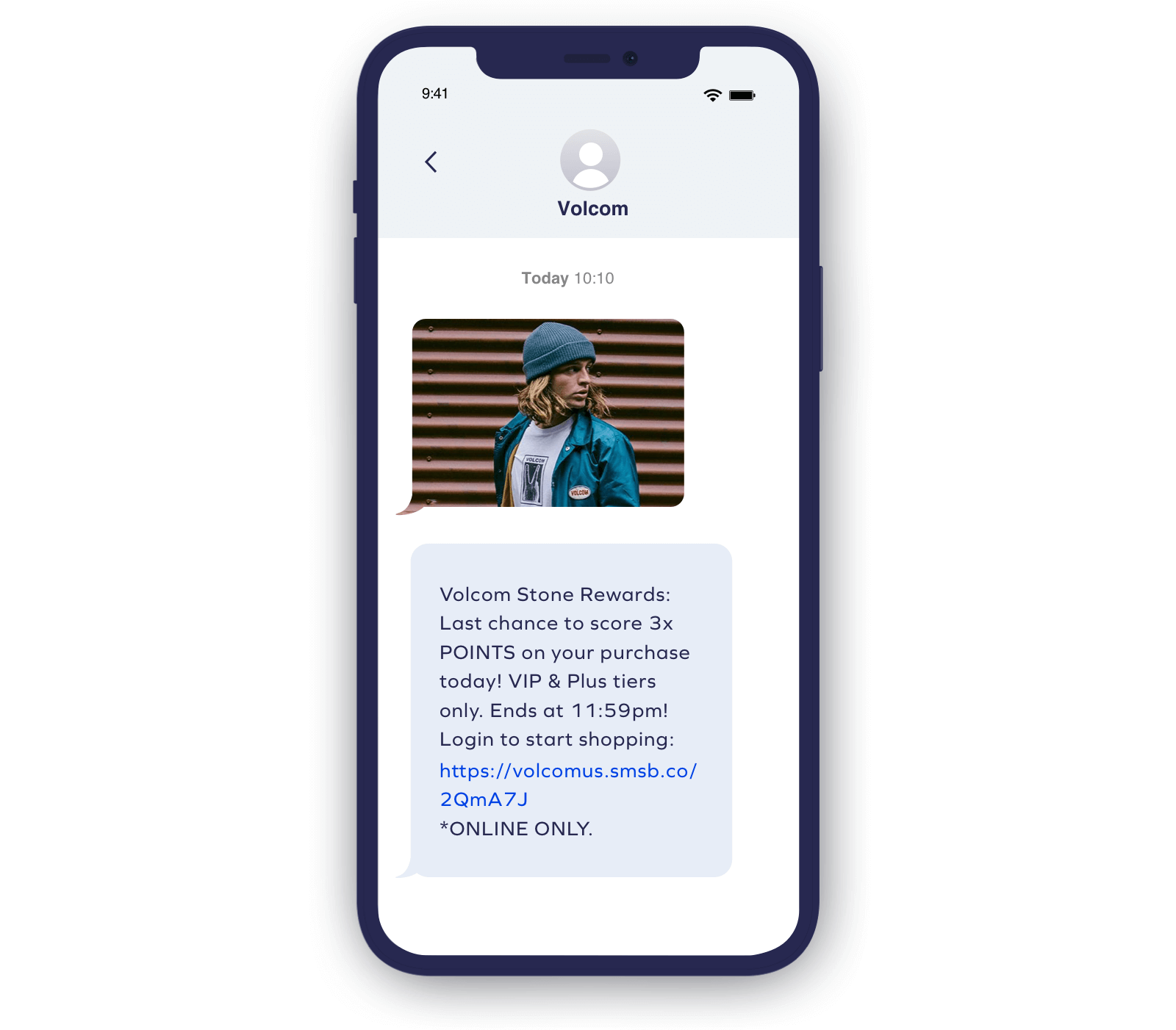 Volcom creează experiențe VIP pentru membrii programului lor de loialitate, Volcom Stone Rewards, oferindu-le oportunitatea de a câștiga mai multe puncte la achiziții. Într-o campanie recentă de marketing prin SMS, marca și-a oferit nivelurile VIP și VIP Plus să tripleze punctele de pe produse, conducând cu ușurință comportamentul programului și maximizând conversia. Pentru a crea în continuare o urgență de cumpărare, aceștia împărtășesc când va expira oferta, astfel încât clienții să acționeze rapid. Membrii fidelității primesc și oferte exclusive de vânzare prin SMS — Promoția extinsă Lucky Day de la Volcom, în special, a oferit abonaților o reducere suplimentară de 40% pentru un ROI impresionant de 81x .