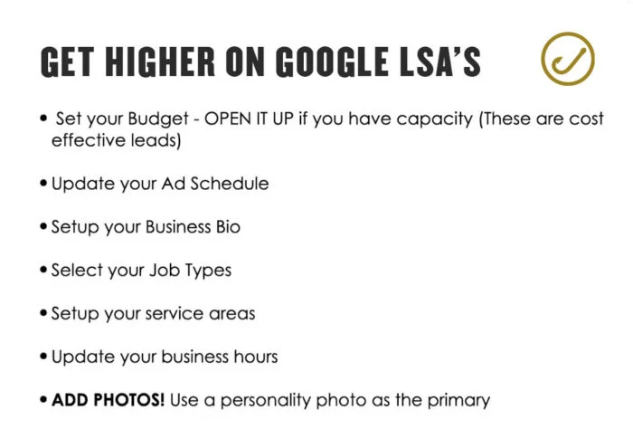 Cu siguranță, optimizarea anunțurilor pentru servicii locale (LSA) sau a programului Google Guaranteed vă poate ajuta să creșteți producția de clienți potențiali și să profitați la maximum de bugetul dvs. Iată câteva dintre cele mai bune practici pentru a realiza acest lucru:
