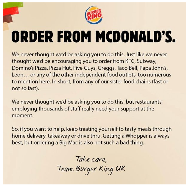 Pandemia a avut parte de cascadorii PR. Una dintre cascadorii noastre preferate a fost a lui Burger King, care s-a adresat publicului său pentru a încuraja mai mulți oameni să comande de la McDonalds, KFC, Subway și încă câțiva dintre concurenții lor, pentru a ajuta la menținerea economiei și pentru a menține localurile noastre de fast-food preferate și alergare.