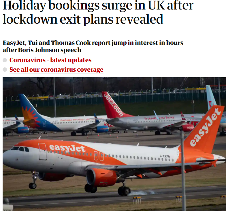 - Rezervările de vacanță cresc în Marea Britanie după ce planurile de ieșire din blocare au fost dezvăluite în The Guardian.