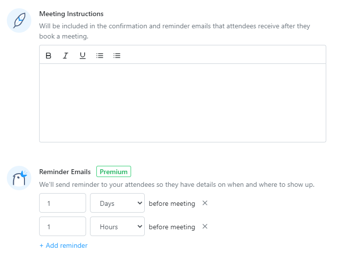 Appointlet vă permite să scrieți e-mailuri personalizate de memento în funcție de tipul de întâlniri pe care le țineți. Mesajele de confirmare sunt difuzate imediat, dar puteți controla când și câte mementouri trimiteți. În general, este o idee bună să le reamintești de două ori clienților potențiali de întâlnire; cu o zi înainte și a doua oară, cu o oră înainte, așa cum se arată mai sus.