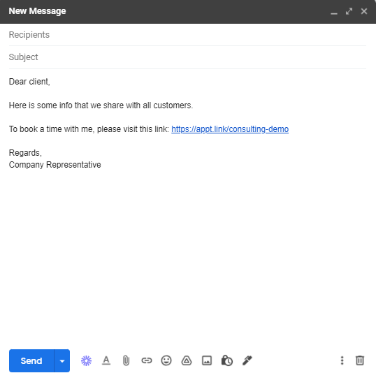 - Utilizați un îndemn clar la acțiune cu un link direct către pagina de rezervare. Nu vă referiți la demonstrația de vânzări ca la „demo de vânzări”. Păstrați limbajul orientat spre rezolvarea nevoilor lor. Link-ul poate spune „Programează apelul pentru [soluție] ” și evidențiază soluția pe care o vei oferi.