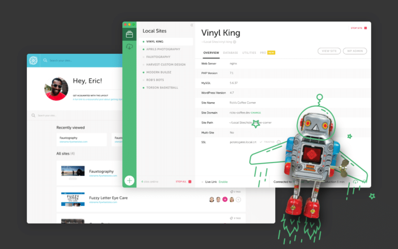 În ceea ce privește mediul local, Local este o platformă gratuită de dezvoltare locală cu care poți începe în mai puțin de cinci minute. Puteți, de asemenea, să conectați site-urile Flywheel sau WP Engine, ceea ce face foarte ușor să trageți în jos o copie a unui site de comerț electronic, astfel încât să cunoașteți mediile și baza de date.