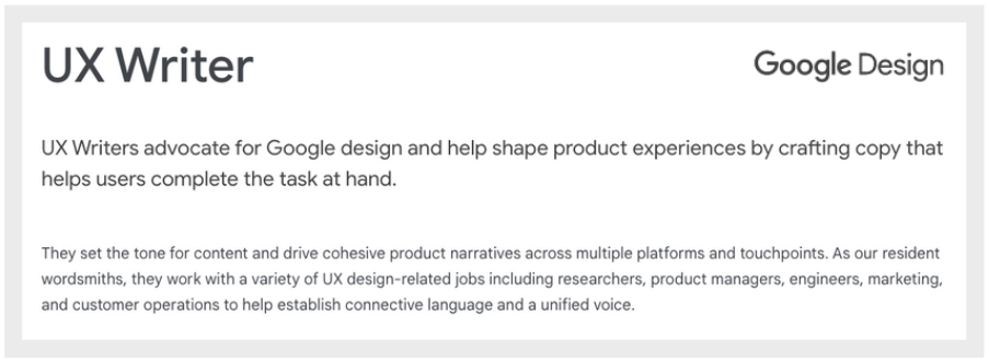 Conform descrierii Google , un scriitor UX creează o copie care îi ajută pe utilizatori să finalizeze sarcina în cauză, conducând „narațiuni coezive despre produse” cu o „voce unificată”.