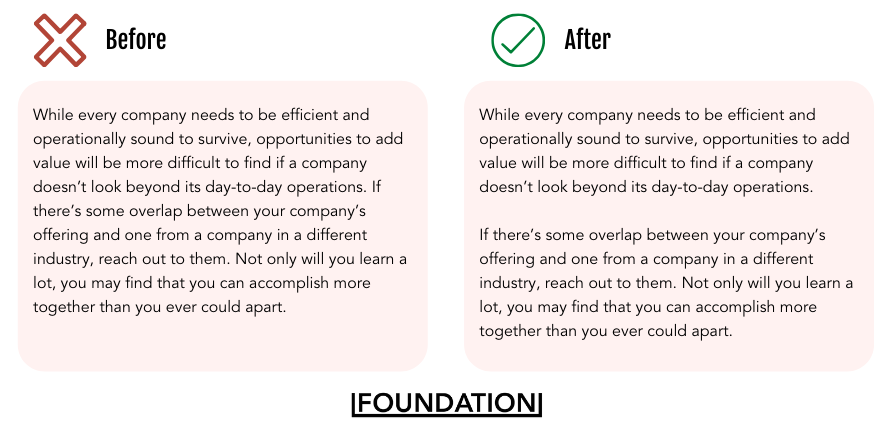 De exemplu, paragraful din stânga ar putea fi despărțit pentru a comunica clar două idei separate: