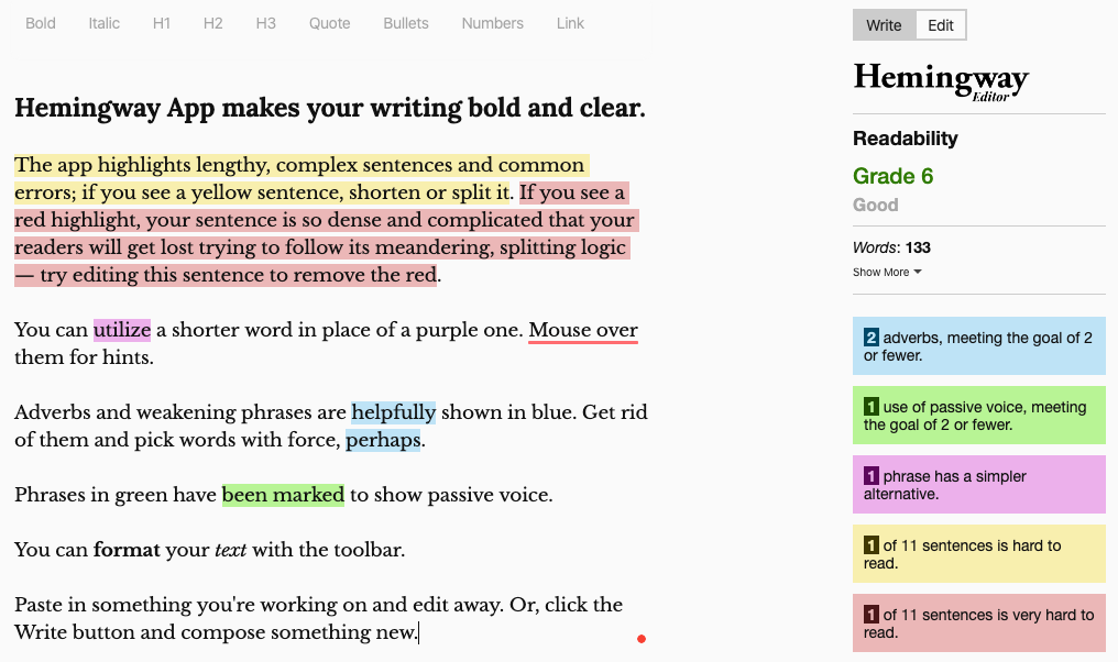 Aplicația Hemingway Editor este un instrument gratuit care va evidenția propoziții lungi, erori comune și limbaj complex în conținutul dvs. Acest instrument vă poate ajuta să identificați zonele care vi se par simple, dar care pot fi mai puțin accesibile pentru alții.