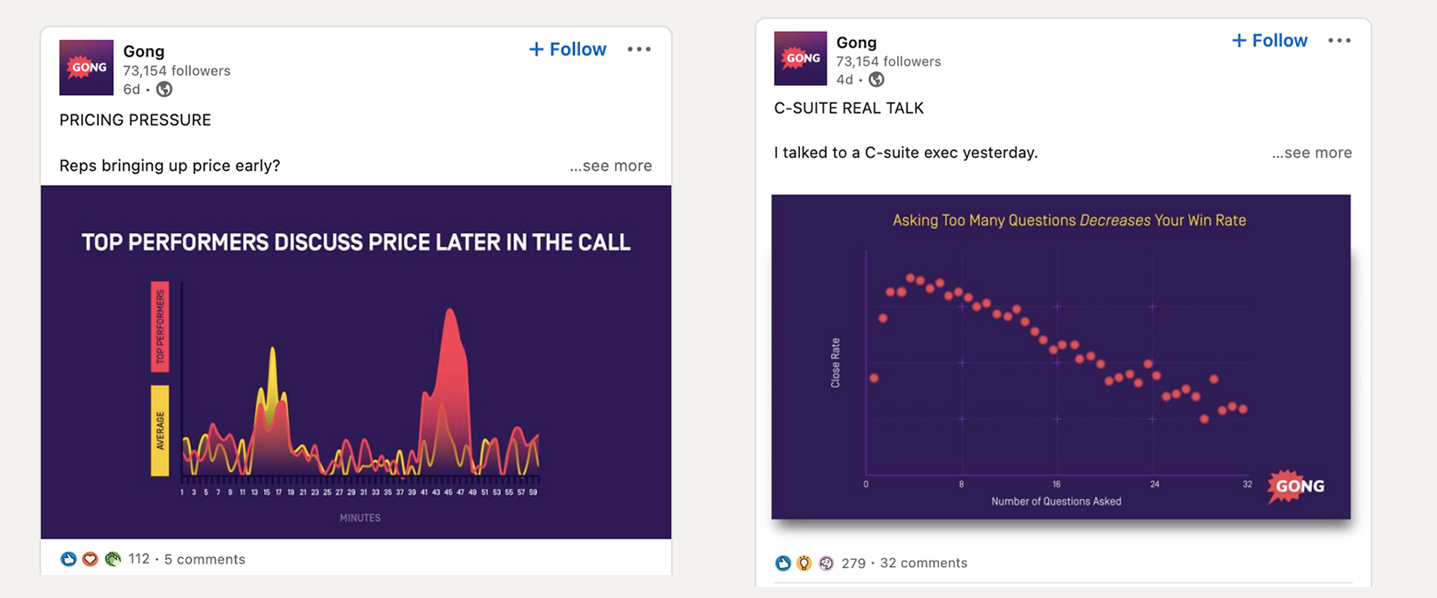 Имея более 212 000 подписчиков в LinkedIn, Гонг публикует около 10-15 постов на странице своей компании каждую неделю, что больше, чем у многих B2B SaaS-компаний за целый год. Несмотря на то, что постоянный объем постов помогает компании оставаться на вершине каналов своей аудитории, качество контента также играет важную роль.