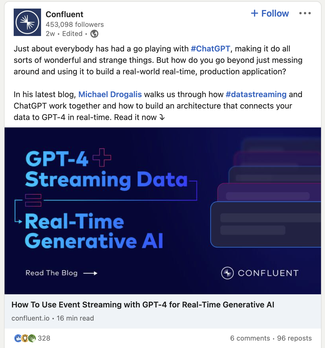 Confluent также использует опыт своих сотрудников для создания сообщений в блогах по актуальным темам отрасли. Например, приведенная ниже переделанная статья вызвала более 300 реакций от подписчиков Confluent: