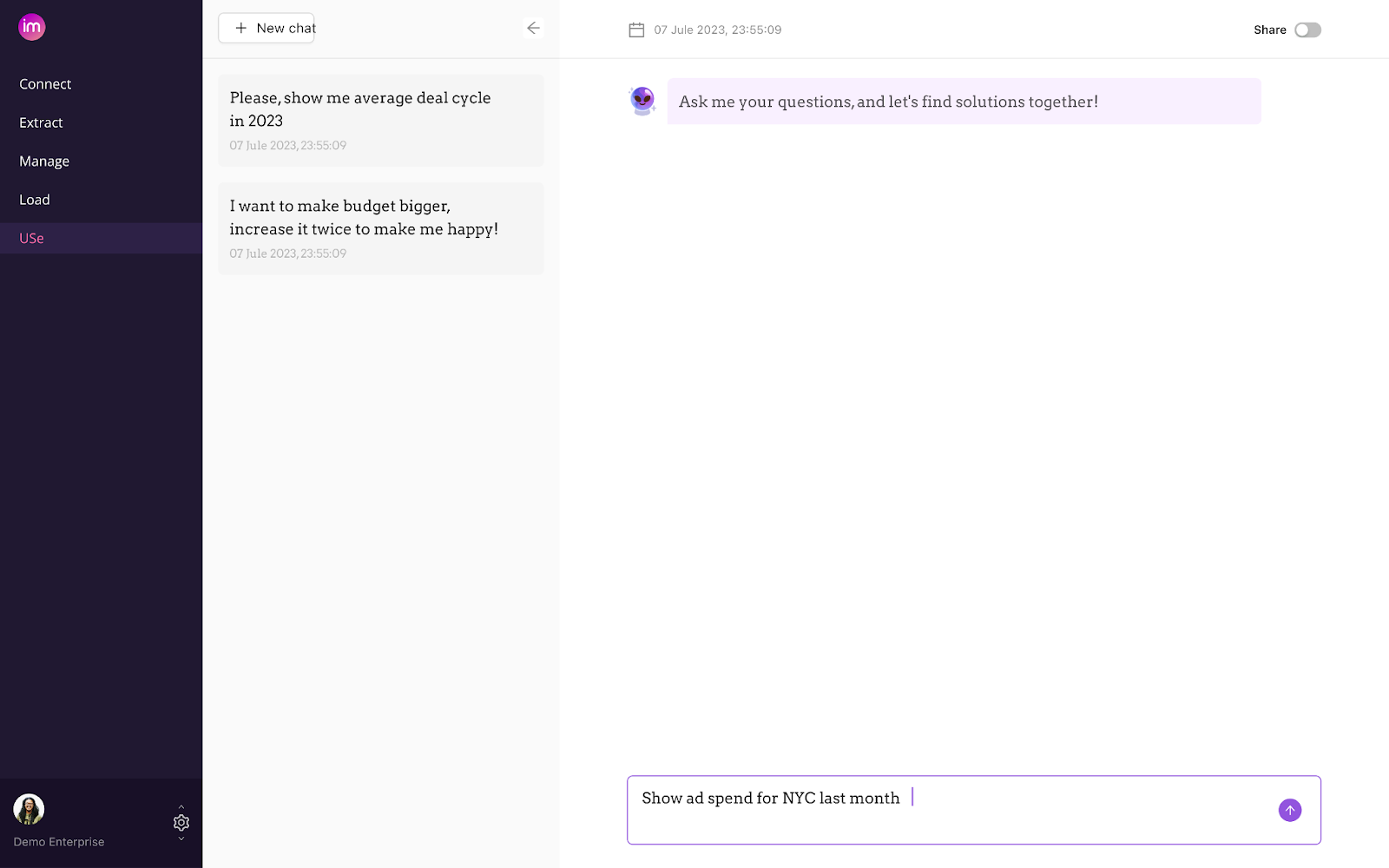 AI Assistant, основанный на искусственном интеллекте и технологии преобразования текста в SQL, устраняет барьеры, которые когда-то стояли между маркетологами и их данными. Вам больше не нужно знать SQL или понимать каждый нюанс структуры вашей базы данных. Вместо этого вы можете напрямую общаться со своими данными на простом английском языке в пользовательском интерфейсе, похожем на чат.