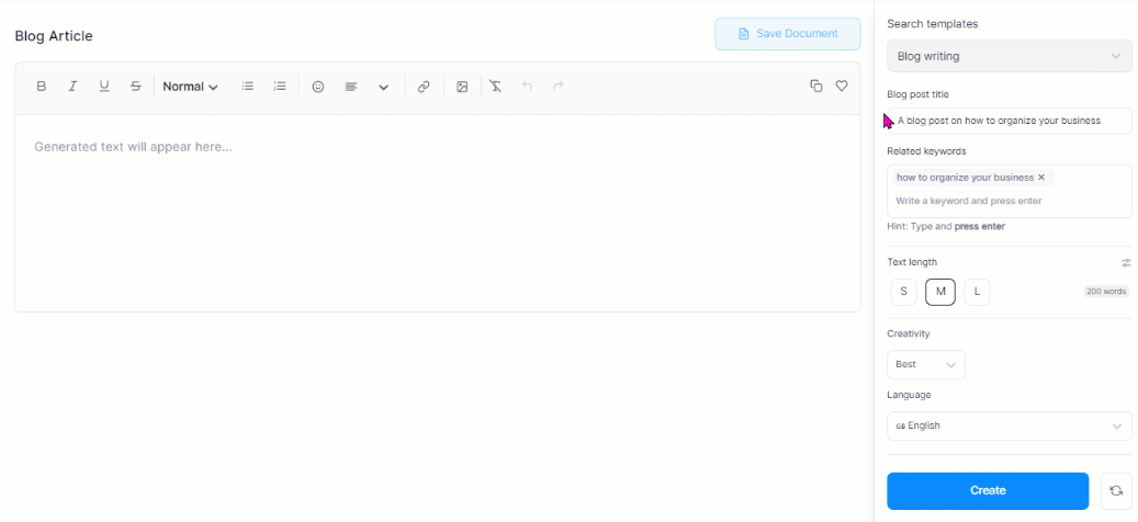 Например, чтобы создать статью с функцией ведения блога , определите тему своего блога , укажите информацию о статье , выберите ключевые слова , установите длину текста и уровень креативности и нажмите « Создать » для создания.