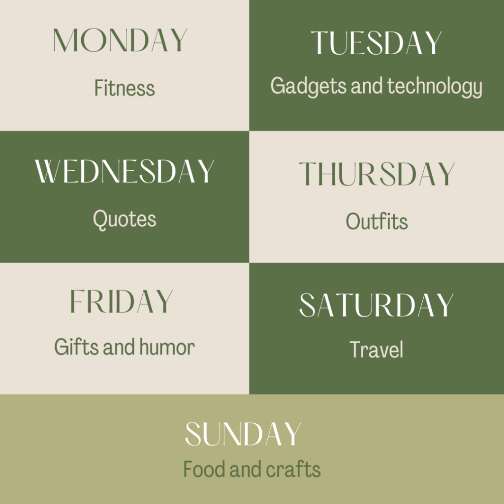Согласно данным Pinterest, определенные темы или ниши, как правило, лучше работают в определенные дни недели. Ниже приведен список