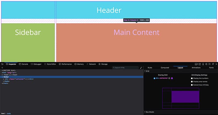 Когда вы разрабатываете макеты или просматриваете другие веб-сайты, Firefox предлагает отличный инструмент для работы с макетами CSS Grid. Он называется CSS Grid Playground и делает изучение сетки очень интуитивным. Перейдя к инспектору, на вкладке макета есть возможность визуально увидеть, как построена сетка. Этот инструмент облегчит процесс проектирования, чтобы исследовать, как различные свойства сетки влияют на общий макет и дизайн сетки.