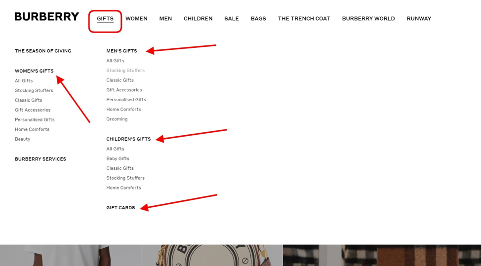 Например, на официальном веб-сайте Burberry целая вкладка «Подарки» размещена самой первой в верхнем меню сайта. Мы можем увидеть более 10 коллекций, каждая из которых собрана на разных страницах.