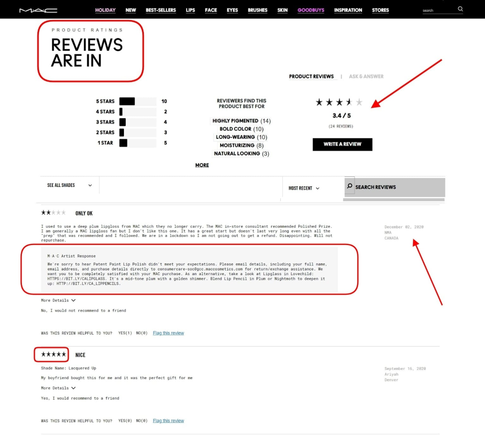 Хорошим примером этого является раздел «Рейтинги продуктов» на официальном сайте MAC Cosmetics. Художник MAC ответил на отрицательный 2-звездочный отзыв. Компания приносит свои извинения за плохой опыт и предлагает решение по обмену/возврату, чтобы компенсировать это.