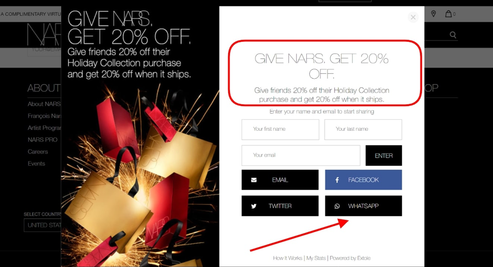 Ниже приведен скриншот, сделанный на официальном сайте NARS Cosmetics. Как видите, их программа лояльности предлагает взаимовыгодные условия для их покупателей и их друзей, сделка «Праздничная коллекция» предусматривает скидку 20%, что является выгодной сделкой.