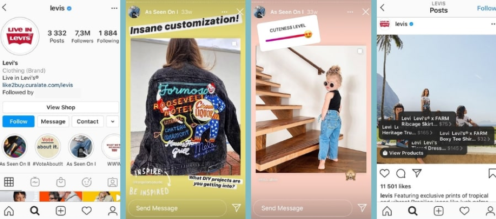 Взгляните на скриншоты из официального аккаунта Levi's в Instagram. Есть два круга, собирающие истории пользовательских постов («Как видно на I» и «Как видно на II»). Кроме того, есть кнопка «Просмотреть магазин» и сообщения с помеченными продуктами, которые выставлены на продажу. Самым большим преимуществом здесь является то, что, нажав на публикацию с продуктами, пользователи могут увидеть некоторые подробности о ней и перейти по ссылке на ваш магазин. А поскольку это делается в социальных сетях, такие покупки могут быть случайными, спонтанными и возвращать ваших подписчиков в магазин.