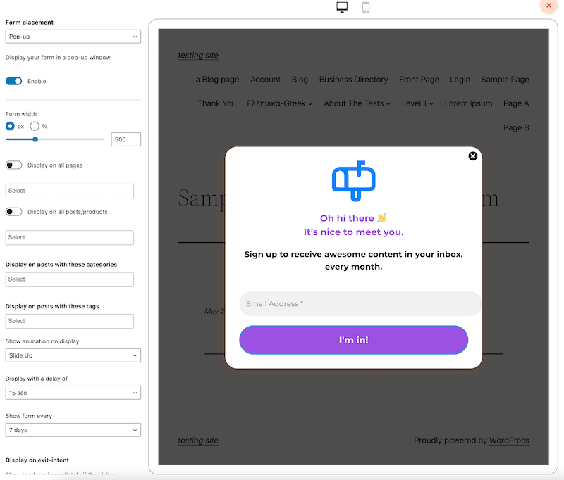 Нажав Preview , вы можете выбрать место для своей формы. Здесь вы также можете изменить ширину всплывающего окна, анимацию и задержку: