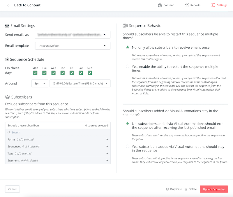 Наконец, нажмите на вкладку « Настройки », чтобы запланировать свою последовательность. Здесь вы можете выбрать конкретные дни и время, когда ваши электронные письма будут отправляться: