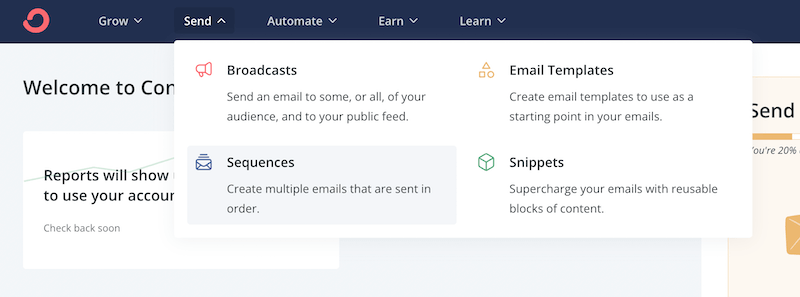 С ConvertKit вы можете разрабатывать капельные кампании по электронной почте, которые запускаются после определенного взаимодействия с пользователем. После создания учетной записи перейдите в « Отправить» > «Последовательности» :