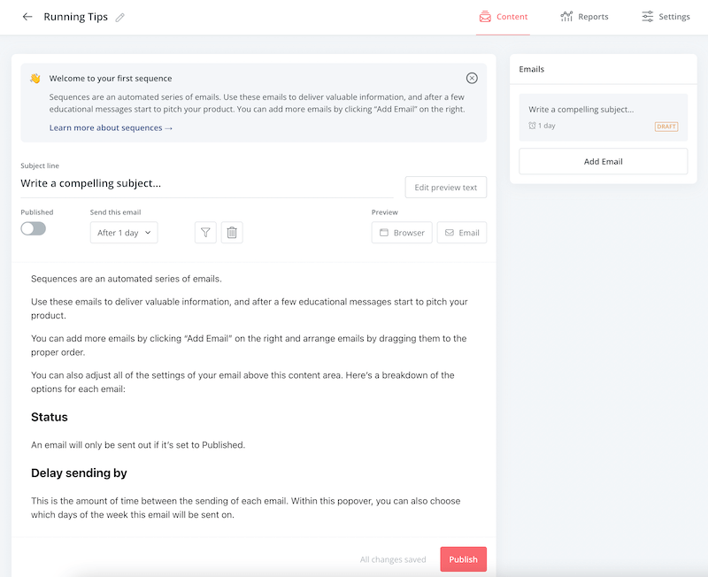 Создайте новую последовательность и дайте ей имя. Теперь вы можете приступить к редактированию содержимого электронной почты: