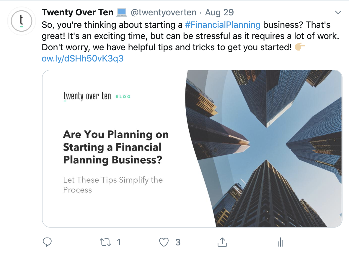 В приведенном ниже примере Twenty Over Ten использует социальные сети, чтобы поделиться недавней записью в блоге.
