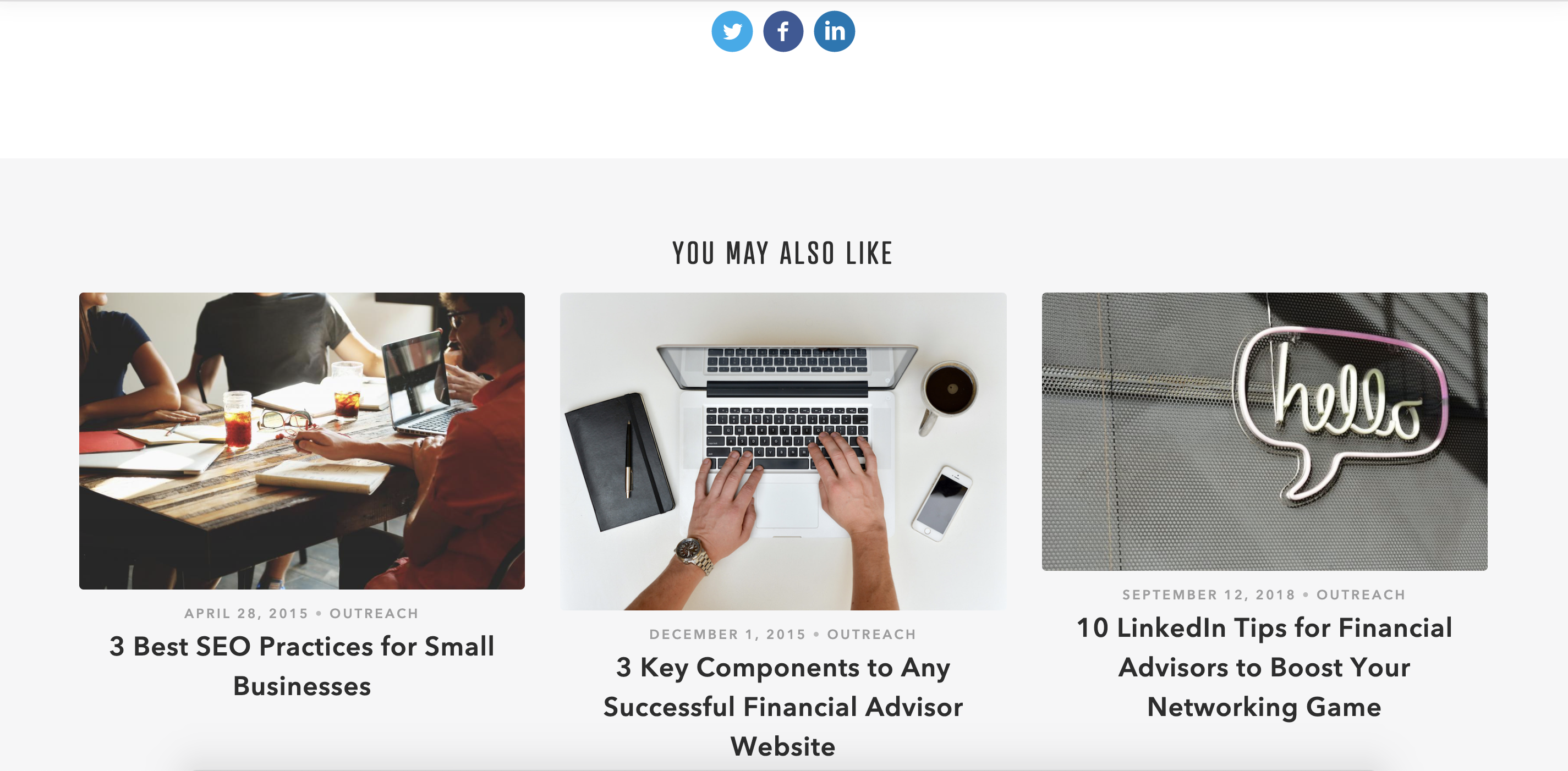 Вы можете внутренне связать контент, поделившись похожими сообщениями в конце своего блога, что также удержит читателей на вашем веб-сайте дольше, поскольку они просматривают другие статьи и контент, который вы создали. Например, в блоге Twenty Over Ten мы включаем ссылки на три дополнительных связанных сообщения в блоге внизу каждого сообщения.