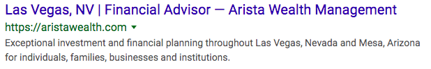 В этом примере над тегом заголовка находится настоящий синий текст «Лас-Вегас, Невада | Финансовый консультант — Arista Wealth Management» — это ссылка в поисковой выдаче, по которой искатель на самом деле нажимает, чтобы попасть на ваш сайт.