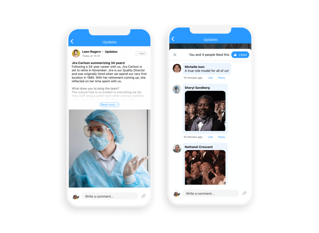 - Отметьте звездных сотрудников, которые делают все возможное, опубликовав сообщение в социальной ленте, и позвольте коллегам поставить лайк, прокомментировать и поздравить победителей. Сотрудники могут даже включать вложения, такие как GIF-файлы, изображения и видео, чтобы признание сотрудников было веселым и увлекательным!