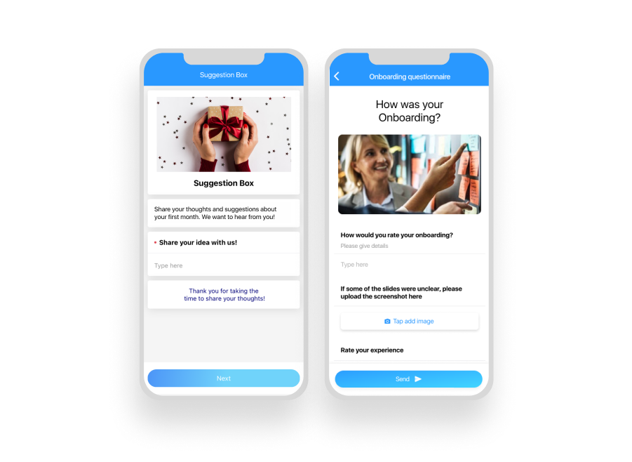 С помощью медицинского приложения Connecteam вы можете легко и эффективно отправлять сотрудникам живые опросы или опросы, чтобы лучше понять, как проходил их процесс адаптации и обучения. Сотрудники могут просто заполнить опрос прямо со своих мобильных устройств в любое время, а менеджеры получат измеримые и полезные данные из отзывов сотрудников.