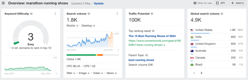 Просто настроив таргетинг на ключевое слово и сделав запрос немного более конкретным , я упрощаю свою работу и по-прежнему могу ориентироваться на многих потенциальных клиентов. Это отличный пример легко висящего ключевого слова, такого как кроссовки для марафонского бега.