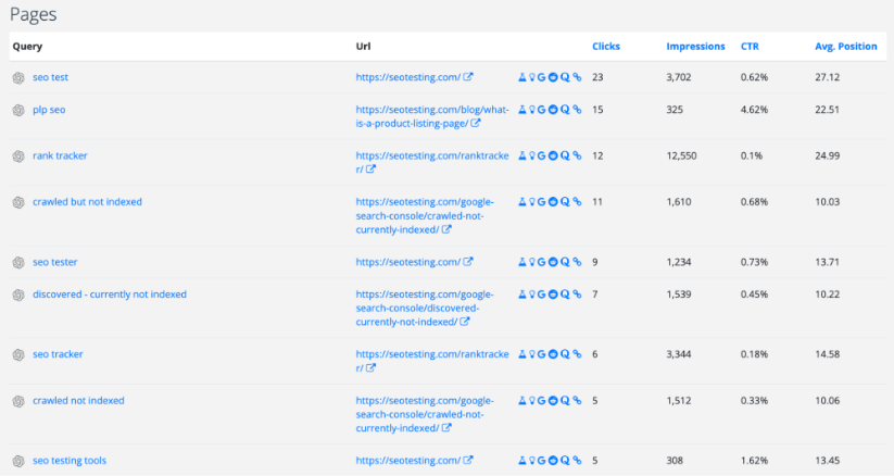 В этом отчете SEOTesting автоматически найдутся все ключевые слова, по которым вы в данный момент находитесь в рейтинге за пределами первых «десяти синих ссылок» в Google: