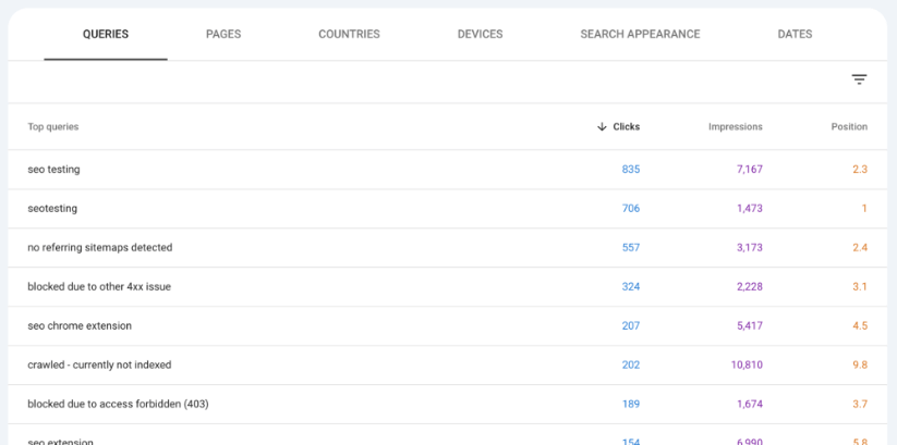 В отчете перечислен запрос, количество кликов, показов, CTR и средняя позиция по этому запросу, чтобы вы могли выделить любые большие возможности для вашего сайта.