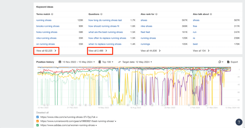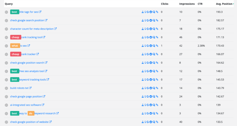 Вы также можете использовать отчет «Ключевые слова с длинным хвостом», в котором будут перечислены все ваши ключевые слова с длинным хвостом, отсортированные по рейтингу от самого низкого до самого высокого, чтобы вы могли найти возможности найти низко висящие ключевые слова и начать работу над их распространением. ранжируйте лучше: