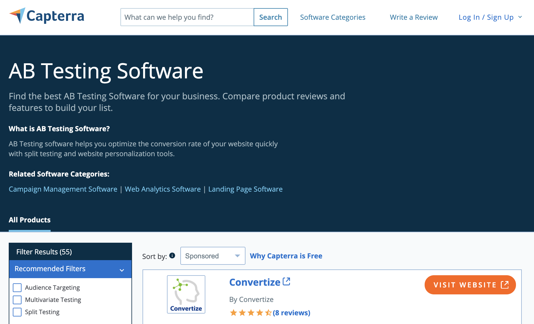TripAdvisor не просто предлагает данные компаниям, которые утверждают свой профиль. Они также предлагают широкий спектр рекламных предложений в виде поведенческого таргетинга, целевого таргетинга, таргетинга на домашнюю страницу, спонсируемых информационных бюллетеней и многого другого. Если вы являетесь компанией-разработчиком программного обеспечения, стремящейся занять первое место в списке категорий Capterra, вам придется заплатить за существенное присутствие на странице списка «Сортировать по спонсируемым» по умолчанию.
