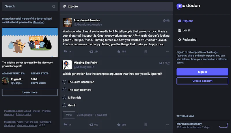 Подобно старым форумам прошлого, Mastodon представляет собой децентрализованную социальную сеть, состоящую из отдельных тематических серверов. В отличие от Reddit, Mastodon делает упор на работу в сети и позволяет отдельным пользователям публиковать короткие сообщения (ранее называвшиеся «Toots»), напоминающие твиты Twitter.