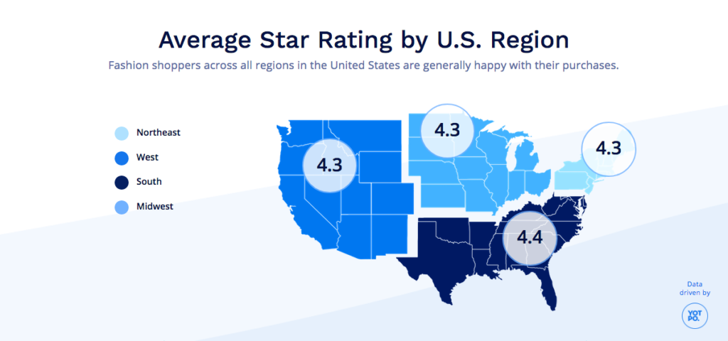 Американские покупатели модной одежды в целом довольны доставкой, и эта тема считается положительной во всех четырех регионах. Тем не менее, анализируя настроения в крупных городских центрах, мы узнали, что покупатели в Лос-Анджелесе на 10,3% более довольны доставкой, чем жители Нью-Йорка . Это стоит иметь в виду, если вы планируете инвестировать в оптимизацию своих операций по доставке в штате.