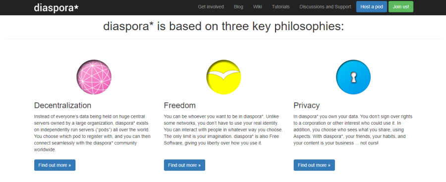 Однако Diaspora*, с другой стороны, является некоммерческой, принадлежащей пользователям и распространяемой платформой социальных сетей. Платформа, основанная в 2010 году, принадлежит и управляется самими пользователями. Он разбит на модули, и они объединены в сеть. Эти модули принадлежат пользователям и управляются ими по отдельности.