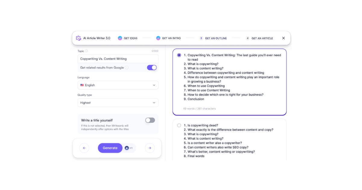 После того, как вы введете тему, язык и тип качества, инструмент предложит несколько вариантов для рассматриваемой темы.