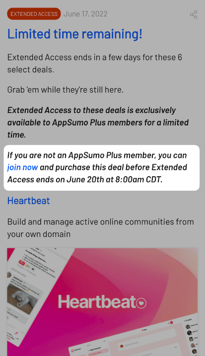 ในเวลาเดียวกัน เรามีผู้เยี่ยมชมเว็บไซต์ AppSumo มากกว่า 50,000 รายต่อเดือน ดังนั้นจึงชัดเจน ว่ามีโอกาสใน สถาน ที่ในการสื่อสารโอกาสมากขึ้นกับลูกค้าของเรา เพื่อรับข้อเสนอที่ให้บริการพวกเขาได้ดีที่สุด