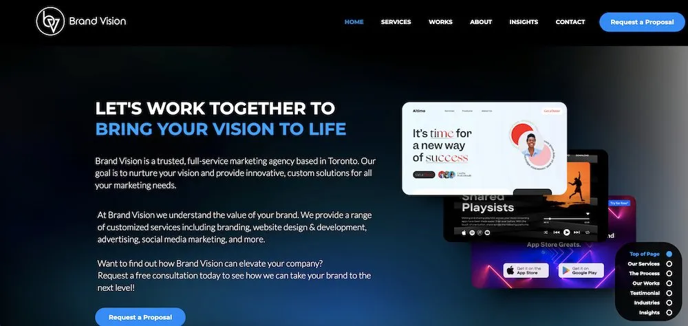 Brand Vision เป็นหน่วยงานด้านการตลาดที่ให้บริการเต็มรูปแบบที่หล่อเลี้ยงวิสัยทัศน์ของคุณและมอบโซลูชันที่เป็นนวัตกรรมและกำหนดเองสำหรับทุกความต้องการด้านการตลาดของคุณ บริษัทนำเสนอบริการต่างๆ รวมถึงการออกแบบเว็บไซต์ การสร้างแบรนด์ การโฆษณาและแคมเปญดิจิทัลแบบชำระเงิน และการตลาดผ่านโซเชียลมีเดีย