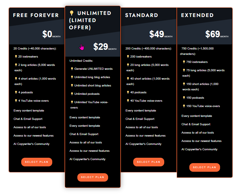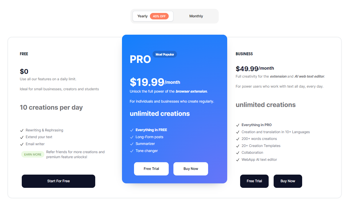 Writecream ให้บริการฟรีตลอดไปและแผนพรีเมียมอีก 3 แผน