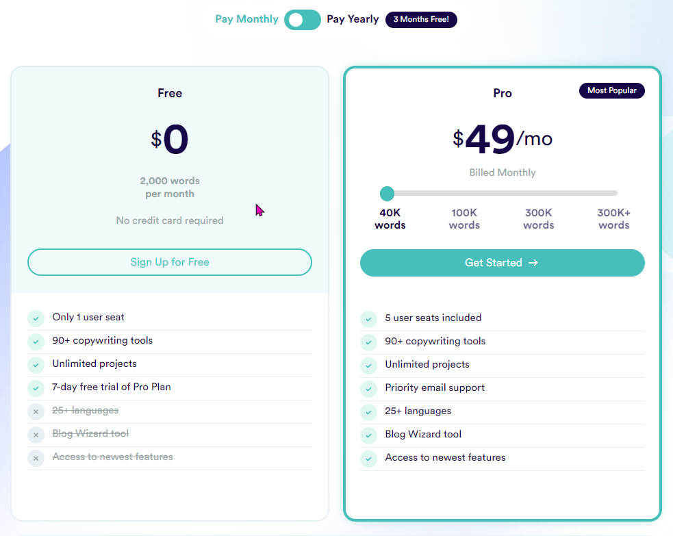 Copy.ai ให้บริการฟรีตลอดไปและแผนพรีเมียมหนึ่งแผน