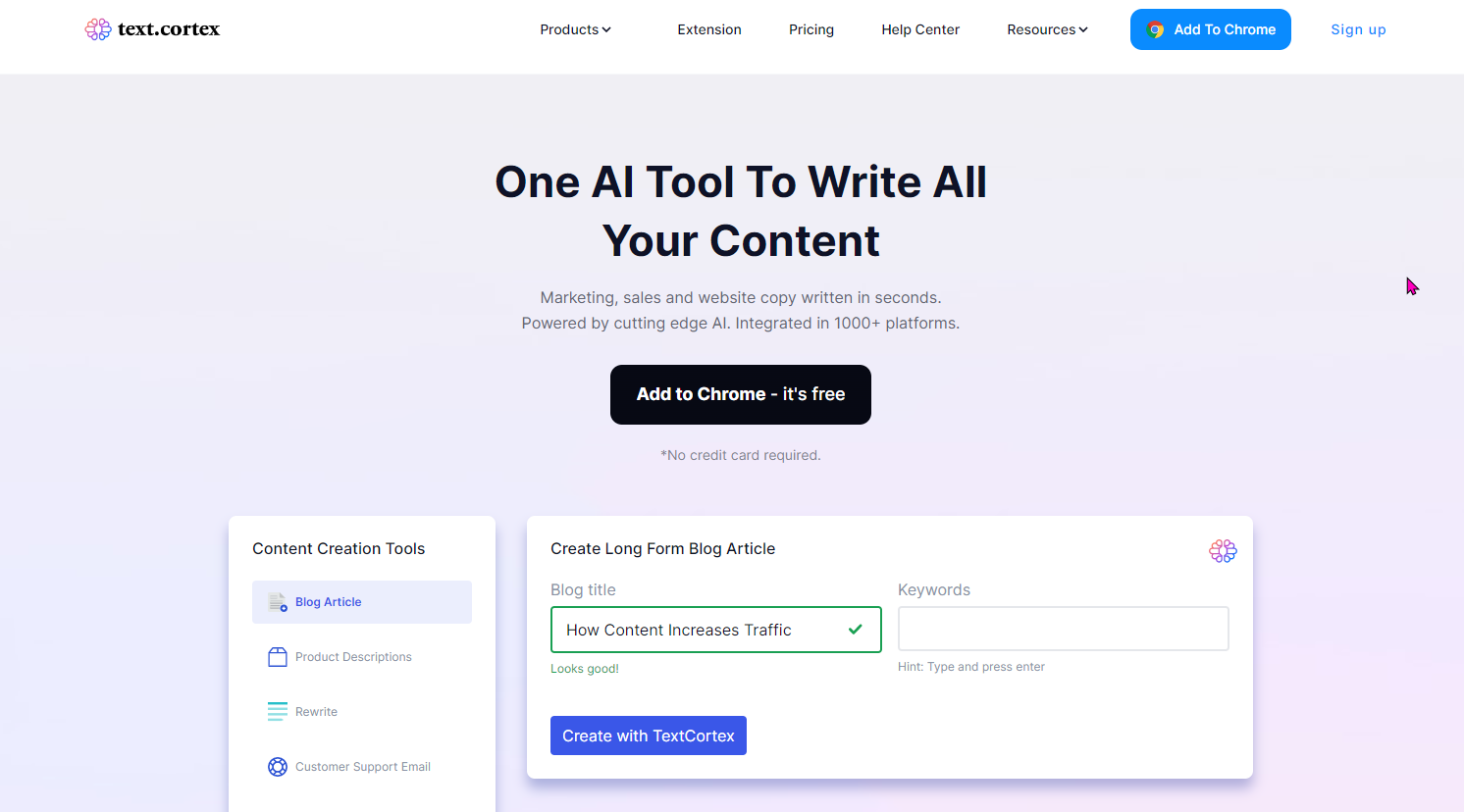TextCortex เป็นเครื่องมือ AI ที่ใช้โมดูลซึ่งสร้างและเขียนเนื้อหาประเภทใดก็ได้ใหม่ให้เป็นเนื้อหาที่ไม่ซ้ำใครและน่าสนใจโดยใช้อัลกอริทึมที่รัดกุมและฐานข้อมูลขนาดใหญ่ของแนวทางปฏิบัติที่ดีที่สุด