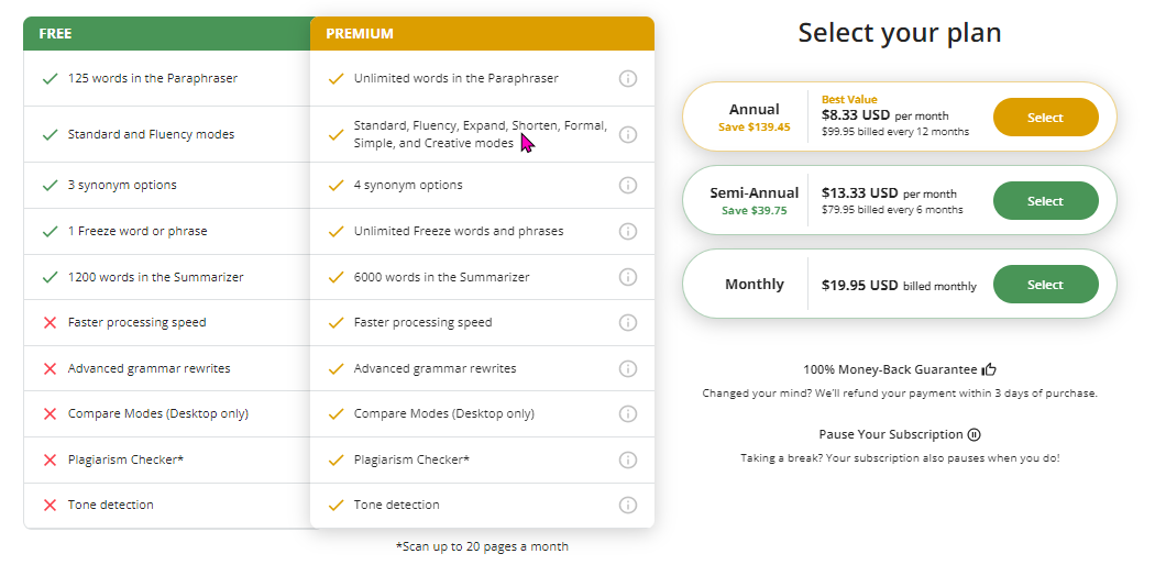 QuillBot มีทั้งแบบฟรีและแบบพรีเมียม